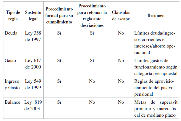 En el caso colombiano, las reglas fiscales han actuado por varios frentes: controles a la autonomía del endeudamiento de las entidades territoriales (Ley 358 de 1997), directrices claras para el aprovisionamiento del pasivo pensional (Ley 549 de 1999), límites cuantitativos a los gastos de funcionamiento (Ley 617 de 2000) y obligatoriedad para definir metas de balance primario (Ley 819 de 2003) (Tabla 1).