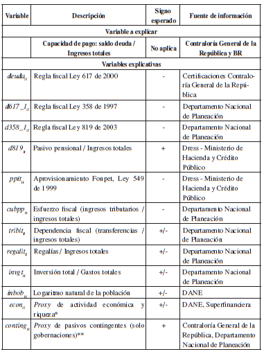 En esta sección se presenta un modelo de datos panel que aporta evidencia empírica a propósito del efecto de las reglas fiscales cuantitativas y otras variables fiscales relevantes (tales como el esfuerzo tributario, la dependencia fiscal, las regalías, la magnitud del pasivo pensional, el tamaño de la inversión y los pasivos contingentes), en la sostenibilidad de la deuda (medida a través de la capacidad de pago) para una muestra representativa de gobernaciones y alcaldías de municipios tanto capitales como no capitales. En primer lugar, se abordará el marco teórico que sustenta el modelo, posteriormente se describirán las variables utilizadas, luego se harán aclaraciones sobre la muestra empleada y finalmente se analizarán los resultados obtenidos.