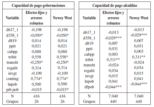 Para las gobernaciones, se encontró que la dependencia fiscal, medida como el porcentaje de las transferencias frente a los ingresos totales, influye positivamente en la capacidad de pago, mientras que para alcaldías el resultado no fue estadísticamente significativo. Por lo tanto, no existe evidencia estadística que respalde la hipótesis de la tragedia de los comunes en el esquema de transferencias intergubernamentales en Colombia.