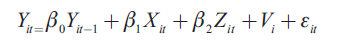 Así, los regresores probablemente estarán correlacionados con los términos de error; además, no se debe descartar la correlación serial, dada la naturaleza temporal de los datos, y se debe considerar que el número de grupos es mayor al de periodos disponibles. Todo esto sugiere usar el estimador propuesto por Arrellano y Bond (1991), basado en el Método Generalizado de Momentos, que emplea los rezagos y diferencias de las variables endógenas como instrumentos. La estructura general de los modelos a estimar sigue la forma de la ecuación (1), donde: Yit es la variable independiente para el panel i en el periodo t; Xit (Zit) es un vector de variables exógenas (predeterminadas o endógenas) para el grupo y momento especificados; Vi es el efecto fijo, particular a i y potencialmente correlacionado con Yit-1; y εites el error.