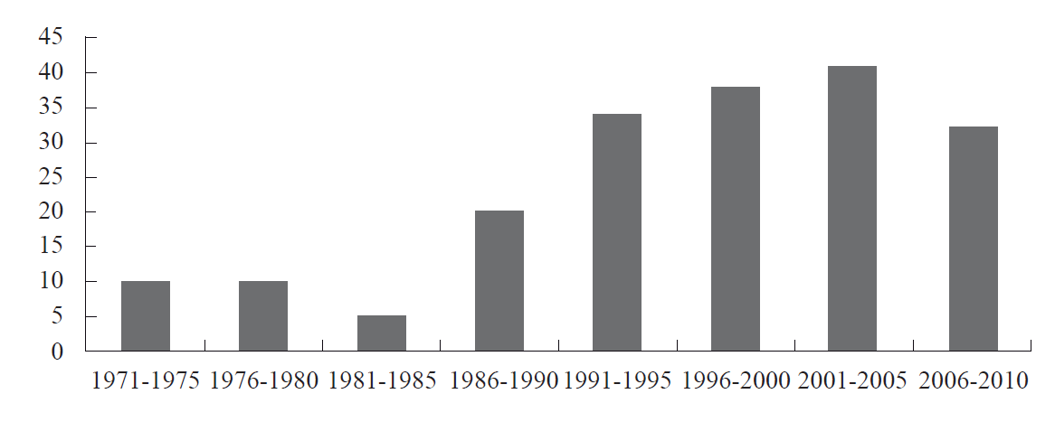 Por ejemplo, los convenios de doble imposición (CDI) se han convertido en instrumentos comunes para tratar el problema que surge cuando dos o más Estados tienen la potestad, según su normatividad tributaria, de gravar la misma renta4. La Gráfica 1 muestra el número de CDI firmados por los países miembros de la Asociación Latinoamericana de Integración (Aladi)5 con el resto del mundo, durante cada uno de los ocho lustros comprendidos entre 1971 y 2010. Se observa un aumento de este indicador desde los años noventa6; un entorno de alta movilidad internacional de capitales que supuso para los gobiernos la necesidad de generar una señal favorable ante los inversionistas internacionales (por ejemplo, que no pagaran impuestos en exceso).