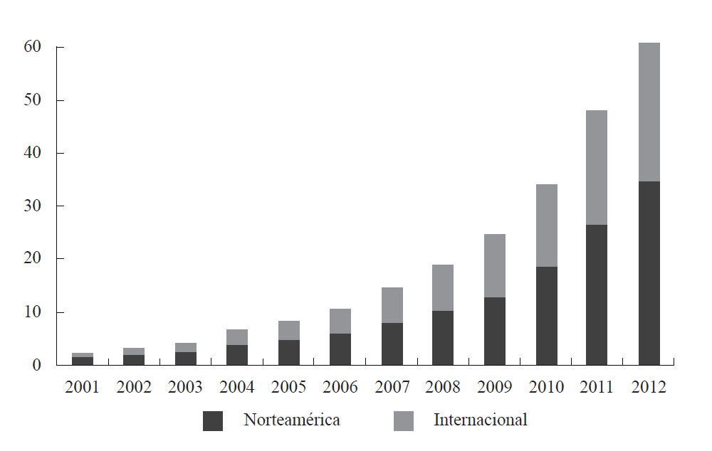 Con respecto al comercio electrónico, este ha crecido a un ritmo vertiginoso, acompañado del desarrollo de las TIC, como lo muestran las estadísticas de eMarketer y Bigcommerce. Esto también se puede evidenciar a través del comportamiento de las ventas netas de tiendas virtuales como Amazon (Gráfica 2), una de las más grandes del mundo. Por tanto, conceptos como el de establecimiento permanente, que en su conceptualización tradicional requiere de un nexo físico que se pueda rastrear, son difícilmente aplicables (Meharia, 2012), pues en muchos casos es imposible identificar el país de la fuente o de residencia del vendedor (a lo que se suma la existencia de figuras como el secreto bancario).