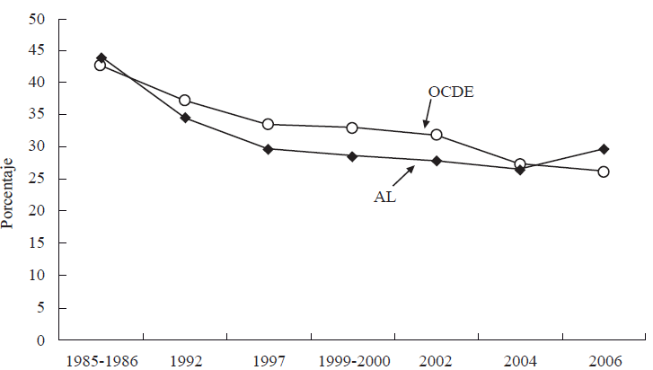 Son varios los factores que llevan a un país a modificar sus impuestos y, con ello, a alterar su estructura y su PT, entre los cuales la globalización es uno de los más importantes. No obstante, las relaciones observadas dependen en buena parte de cómo se analice el tema tributario, ya sea a través de las alícuotas o de la recaudación (idea que se profundizará en la sección empírica). Por lo pronto, las Gráficas 3 y 4 muestran para dos grupos de países, algunos de América Latina y otros de la OCDE, que efectivamente ha cambiado su tributación; ganó importancia el IVA y se redujo la dependencia del comercio exterior, mientras que para los ISR la evidencia no es concluyente.
