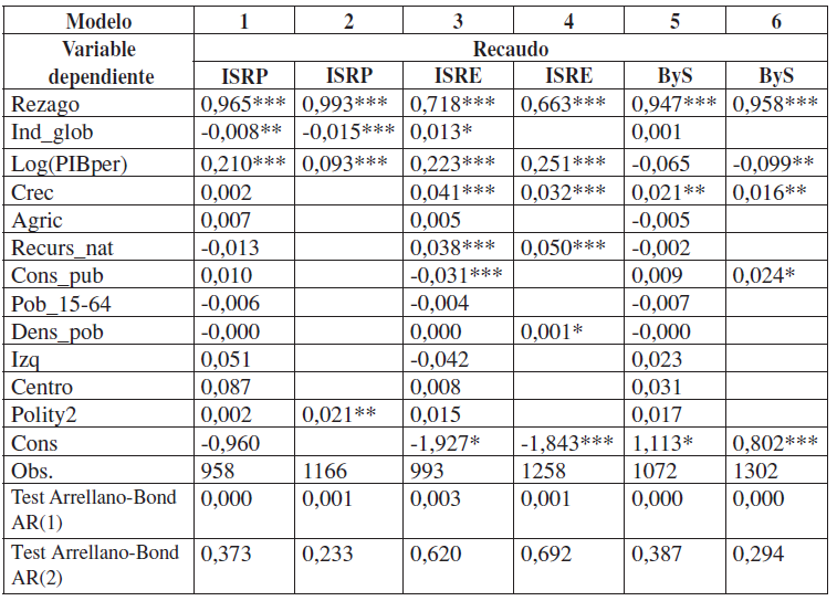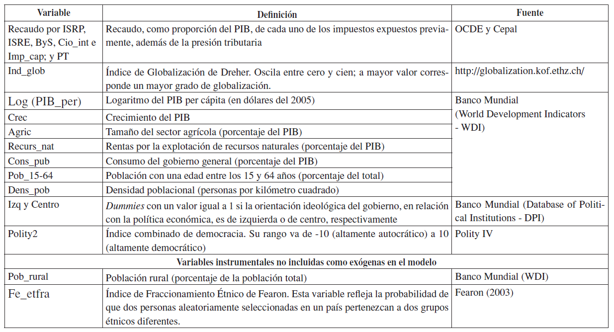 En primer lugar, los cambios en la recaudación de cada uno de los impuestos analizados no son bruscos; se observa cierta dependencia de la trayectoria en cada país, lo que daría lugar a considerar la naturaleza dinámica del fenómeno. También es probable que surjan problemas de endogeneidad causados por más de una variable, en particular Ind_globalización y Cons_pub; la baja recaudación, en particular de los ISR, podría atraer capitales foráneos y profundizar el proceso globalizador, del mismo modo como la recaudación al financiar el gasto público eventualmente determinará su nivel.