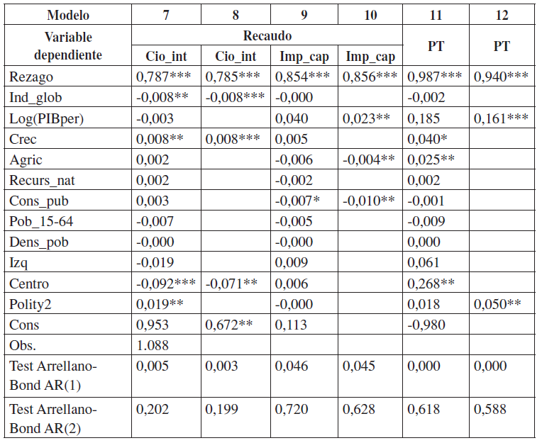 Por último, y en relación con la PT, las únicas variables relevantes tras el proceso iterativo de eliminación de aquellas no significativas estadísticamente son: Log(PIBper) y Polity2. En el caso de la primera, su coeficiente positivo coincide con los hallazgos que tradicionalmente se han obtenido en la literatura que estudia los determinantes del recaudo (Gupta, 2007; Martín-Mayoral y Uribe, 2010), lo que insinúa que el desarrollo económico va de la mano con la capacidad fiscal de los Estados; mientras que para la segunda, otros trabajos (Acemoglu y Robinson, 2006) sostienen que la democracia es importante para redistribuir recursos (por ejemplo, a través del ISRP, según lo corrobora el modelo 2), favorece el crecimiento del Estado de bienestar y fortalece el sistema tributario, lo que es consecuente con el modelo 12 y otros trabajos empíricos (Dioda, 2012).