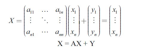 (1)Aquí, X es un vector n × 1, que recoge en cada elemento xi la producción bruta de cada uno de los n sectores económicos. Y es un vector n × 1, con los componentes de la demanda final. Finalmente, A es una matriz n × n, denominada de requerimientos técnicos y conformada por los coeficientes aij, que indican cuáles son las necesidades del insumo i por unidad de producción bruta del sector j. Cada coeficiente es fijo para el período de construcción de la MIP, suponiendo retornos constantes a escala.