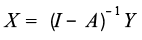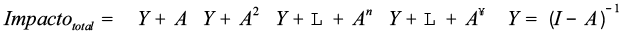 (2)Donde I es la matriz identidad. La matriz (I-A) se conoce como matriz de Leontief, mientras que la matriz (I-A)-1 se denomina matriz inversa de Leontief y cada una de sus celdas denota los requerimientos totales (directos e indirectos) en la obtención de la producción de cada sector. Entonces, (I-A)-1 recoge el efecto multiplicador de un cambio exógeno en la demanda final, lo que puede expresarse como:
