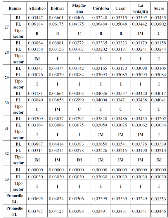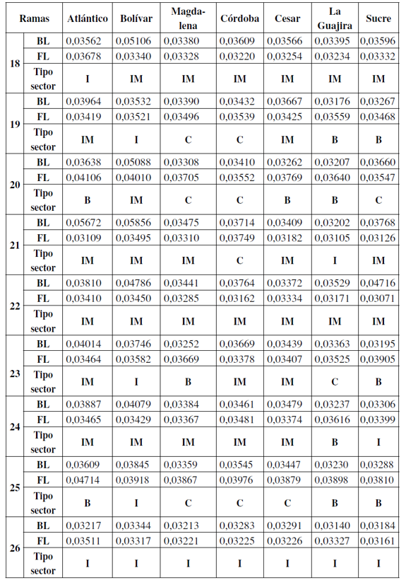 Uno de los análisis que permite el contexto input-output es la determinación de los sectores clave de una economía, a partir de la noción de encadenamientos hacia atrás (BL) y hacia delante (FL). Por tal motivo, se complementa la exposición de multiplicadores con la identificación de actividades clave dentro del Caribe colombiano, haciendo uso del método de extracción hipotética propuesto por Sonis et al. (1995). Esta metodología considera apropiado separar una rama, antes que extraerla, para analizar qué sucedería en la economía ante la ausencia de dicho sector.