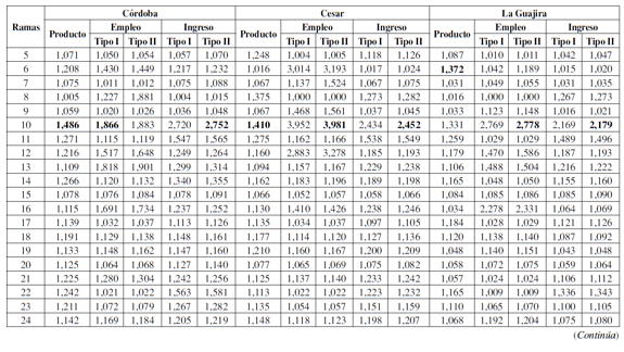 No obstante, los multiplicadores para las demás actividades no resultan, en promedio, muy altos y su clasificación, según sus encadenamientos, varía de acuerdo con las características productivas de cada departamento, lo cual demuestra que el Caribe colombiano es una región con una estructura económica heterogénea y con poca interdependencia.