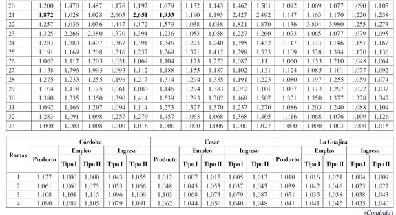 También son representativos los multiplicadores de sectores, como el suministro de electricidad, construcción y transporte acuático, sobre todo en empleo e ingreso, y para departamentos ricos en recursos del suelo, las actividades de extracción minera.