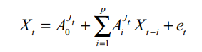 (1)donde Xt es el vector de variables endógenas, p es el número de rezagos óptimos, A0 es el vector de constantes, Aies el vector de coeficientes en el retardo i, y et es el vector de errores que siguen una distribución . Jt es el indicador de estado, donde existen J regímenes. La idea de estos modelos es la linealización de J tramos (Tong, 2011). La variable de estado tiene un papel primordial ya que la determinación de esta implica la utilización de modelos, estrictamente, TAR (o Smooth TAR, STAR) frente a VAR con cadenas de Markov (MSVAR). Para los primeros, la variable Jt se identifica de manera exógena; mientras que para los segundos los estados se estiman endógenamente porque son inobservables.