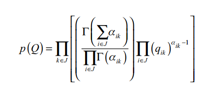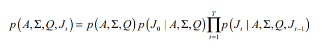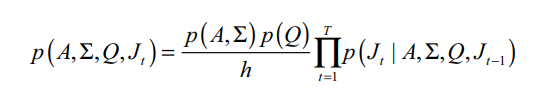 (3)donde Γ es la función estándar Gamma, αik es un parámetro positivo de la función. Con base en lo anterior, se asume una densidad conjunta preliminar de los parámetros (A,Σ), la matriz de transición (Q) y la variable de estado (Jt) :