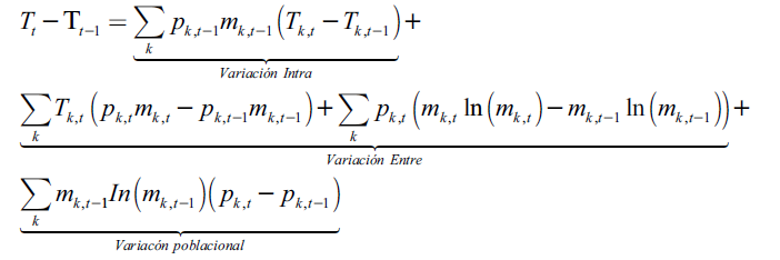 Así como en un momento dado del tiempo el nivel de desigualdad se explica por desigualdades al interior de los departamentos y las desigualdades entre ellos, los cambios de la desigualdad (aproximada por el índice de Theil) en el tiempo se pueden explicar por cambios distributivos entre e intradepartamentos, así como por cambios composicionales en los grupos considerados, en este caso, por cambios en la participación poblacional de cada departamento, o por migraciones entre ellos. Al tomar diferencia de la ecuación (5) en dos momentos del tiempo (t y t – 1), se tiene como resultado la ecuación (6), la cual mide la participación de cada tipo de desigualdad en la variación total del índice de Theil, teniendo en cuenta los cambios composicionales (Mookherjee y Shorrocks,1982).