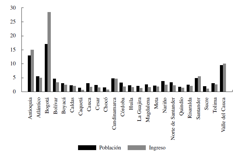 Colombia está conformada por 32 departamentos y el Distrito Capital de Bogotá; cuenta con una población aproximada de 48 millones 800 mil habitantes y un producto interno bruto per cápita de 5.300 dólares. Su concentración económica y poblacional se presenta en Bogotá y Cundinamarca, Antioquia, Valle del Cauca y Santander, los cuales en su conjunto participan con el 48,6% de la población y el 63,3% del ingreso total (véase el Anexo 1). Como se ilustra en la Gráfica 1, en Colombia hay cierta polarización entre los principales centros económicos geográficos y el resto de departamentos que tienen mayor participación en la población que en el ingreso.