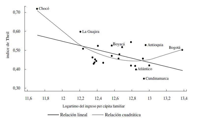 En el caso del análisis de la desigualdad por departamentos en Colombia se observan heterogeneidades y diferencias en la asociación indicada por Kuznets. Los departamentos con menores ingresos son los que tienen mayores niveles de desigualdad, los departamentos con menores niveles de desigualdad tienen elevado ingreso promedio, las zonas con más alto ingreso y donde se concentra la mayor parte de la población tienen importantes niveles de desigualdad, y en el medio de esas situaciones hay departamentos con similares niveles de ingreso, pero con diferentes niveles de desigualdad. De acuerdo con lo encontrado en el caso de Colombia, la relación, en promedio, entre niveles de ingreso medio y desigualdad tendría forma de U, decreciente en la sección de bajos ingresos, llegando a un mínimo e invirtiéndose la relación al llegar a un nivel de ingresos elevado.