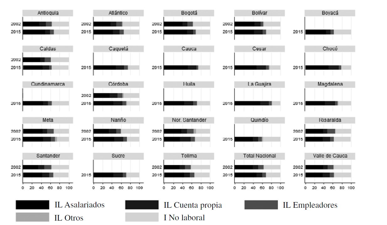 No hay un patrón claro que indique las heterogeneidades en la participación de cada fuente de ingreso. Se encuentran departamentos centrales como Antioquia y Cundinamarca, así como Bogotá, con participaciones del ingreso de los asalariados de 46,5%, 44,2% y 49,5% en el ingreso total. No obstante, también departamentos con bajo nivel de ingreso y con la desigualdad más elevada, tienen participaciones elevadas de la participación del ingreso de los asalariados, como es el caso de La Guajira y Chocó, con 43,4% y 40,5%. Por otro lado, departamentos con elevado nivel de informalidad y un destacado rol de los trabajadores por cuenta propia, presentan bajo porcentaje de ingreso como asalariados. Se destacan en este aspecto departamentos de la costa Caribe (Córdoba, Magdalena y Sucre), y departamentos de frontera (Nariño y Norte de Santander). Con respecto a la participación del ingreso no laboral, para la mayoría de departamentos está entre 24% y 35%, y solo es inferior a ese porcentaje en La Guajira.