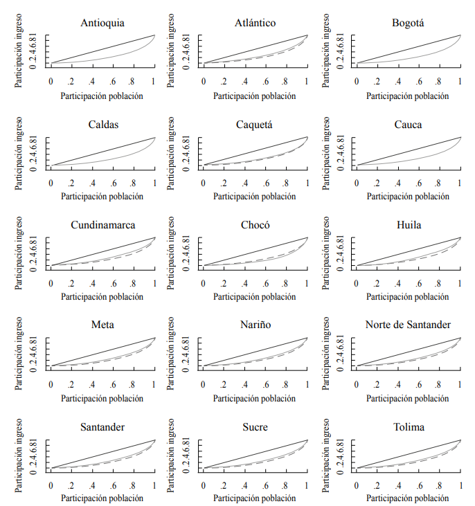 La reducción del 9% en el coeficiente de Gini entre el 2002 y el 2015 en el total nacional, es resultado de grandes heterogeneidades en el cambio de la desigualdad por departamentos. Antioquia, Atlántico, Risaralda y Bogotá presentaron una notable reducción de la desigualdad, mientras que en Caldas, Norte de Santander y Tolima se mantuvo el nivel de desigualdad. Las razones de esas situaciones en el tiempo son también diversas entre departamentos, aunque de manera generalizada los cambios en el componente del ingreso no laboral han tenido los mayores efectos redistributivos.