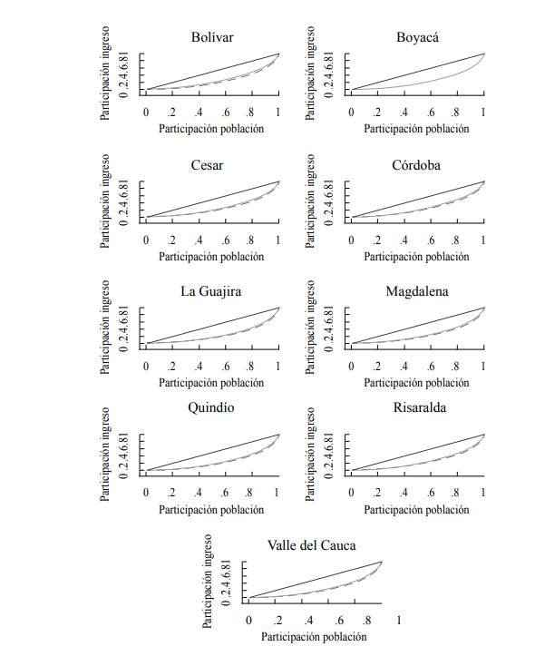 En el caso contrario se encuentran Cundinamarca y Atlántico, dos departamentos con los menores niveles de desigualdad del IPCF, lo cual es un resultado robusto si se comparan los cuatro indicadores ilustrados en la Tabla 1. Son, a su vez, departamentos con elevados niveles de ingreso y una baja tasa de pobreza (en términos relativos).
