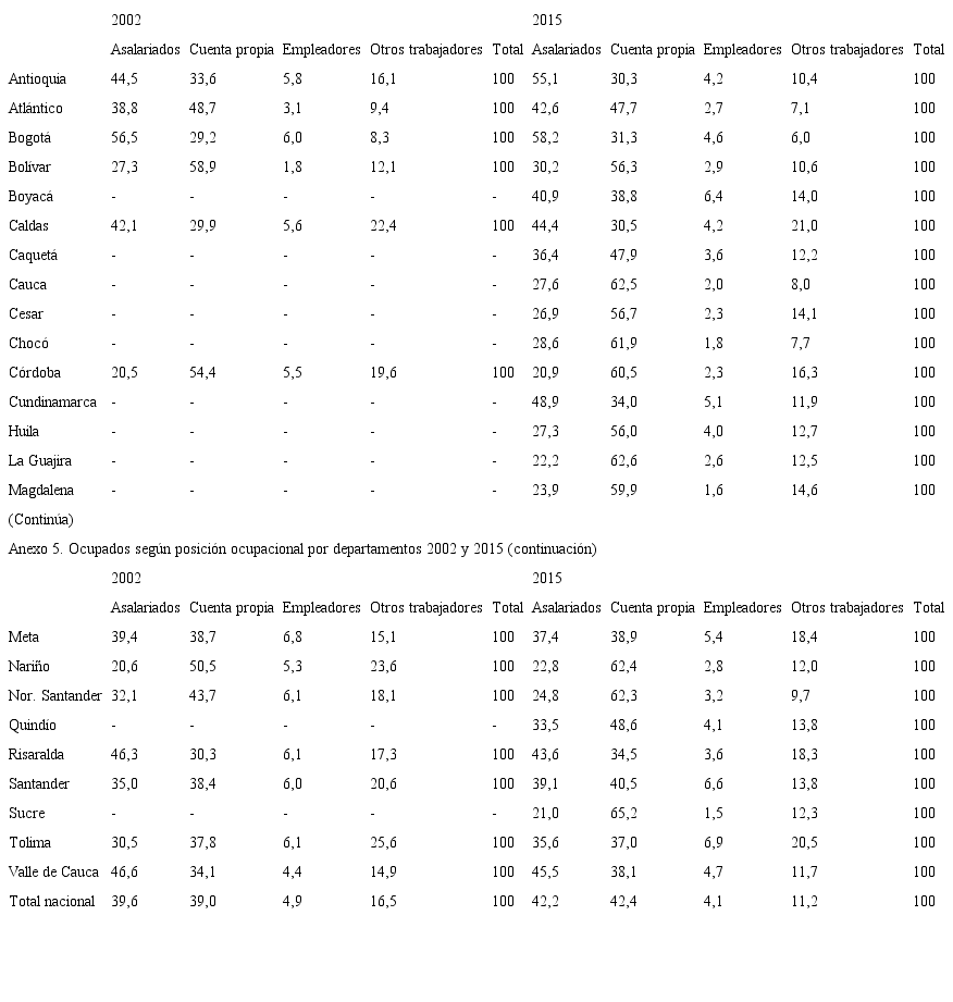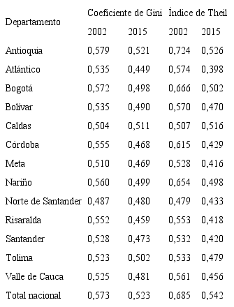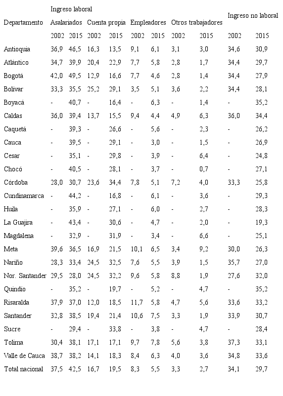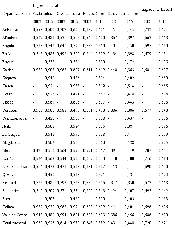 (10)Como se presenta en la Tabla 5, la desigualdad medida por el coeficiente de Gini no se redujo en la misma magnitud en todos los departamentos del país entre el 2002 y el 2015. En Caldas, Norte de Santander y Tolima, prácticamente no cambió: en Caldas, por el ingreso de asalariados y trabajadores por cuenta propia, en Tolima por el de los asalariados, y en Norte de Santander por el de los trabajadores por cuenta propia, quienes aumentaron su participación en el empleo departamental, sumado a que fue la única fuente de ingreso que presentó un aumento de la desigualdad entre los años considerados.