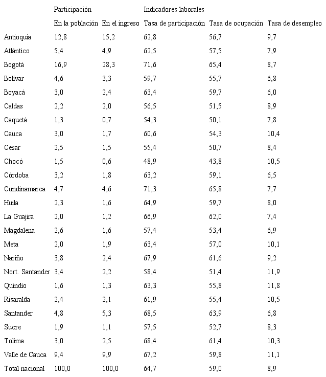 Mientras que Bogotá participa con el 16,9% de la población y el 28,3% del ingreso, los departamentos de Caquetá y Chocó participan con menos del 1% del total de ingreso y el 1,4% de la población. La mayor brecha entre la participación del ingreso y de la población se encuentra en los departamentos reconocidos como más pobres o rezagados del país, a saber: Caquetá, Cauca, Chocó, Córdoba, La Guajira y Sucre. Esas diferencias también se reflejan en las heterogeneidades del mercado laboral. Aquellos departamentos con menores ingresos tienen bajas tasas de ocupación, los que tienen mayor participación en el ingreso presentan elevados niveles de participación laboral, mientras que los niveles de desempleo difieren notablemente entre diferentes departamentos, oscilando entre 6,0% (Boyacá), y 11,9% (Norte de Santander) (véase el Anexo 1). Tomando como referencia esas heterogeneidades, el presente artículo profundiza en el estudio de la desigualdad del ingreso por departamentos en Colombia.