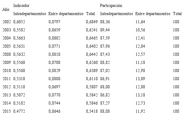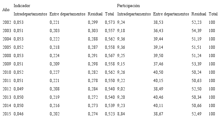 En la Tabla 2 se ilustra el resultado de la descomposición del índice de Theil en Colombia por departamentos desde el 2002 hasta el 2015. La principal observación que se deriva de los resultados es que la reducción de la desigualdad (medida por el Theil) de 20%, entre el 2002 y el 2015, no ha estado asociada de manera preponderante a una reducción de las brechas entre los departamentos en Colombia. De ahí que la participación de la desigualdad entre departamentos explique el 11,6% de la desigualdad en el 2002, y el 11,9% en el 2015. Como se observa en la Gráfica 5, el índice de Theil tiene mayor variabilidad que el coeficiente de Gini, variabilidad que se refleja en las partes que lo componen. A pesar de esas variaciones, la participación de los componentes de la desigualdad intra y entre áreas geográficas ha permanecido relativamente estable, indicando la persistencia de la desigualdad entre los departamentos en Colombia.