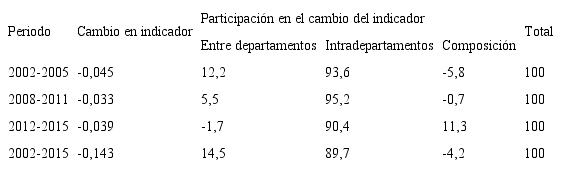 (6)Los resultados de las estimaciones de la descomposición dinámica del índice de Theil para varios periodos de referencia se observa en la Tabla 3. En concordancia con la descomposición intra y entre departamentos, en esta descomposición dinámica se observa cómo, al menos el 90% de la reducción de la desigualdad en Colombia, es resultado de cambios distributivos igualadores al interior de los departamentos, resultado que se acentuó entre el 2008 y el 2011, periodo en el que prácticamente toda la reducción de la desigualdad fue consecuencia de cambios intradepartamentos. En ese cuatrienio hay que destacar el exitoso rol del departamento de Antioquia, el cual es el de mayor participación poblacional (después de la capital del país), y redujo en ese lapso el índice de Theil de 0,6748 a 0,55, la mayor reducción de la desigualdad en los departamentos colombianos en todos los cuatrienios considerados. Tomando como referencia el periodo completo (2002-2015), se observa que la reducción de la desigualdad intradepartamentos se explica en dos terceras partes por la reducción de la desigualdad de Antioquia, Atlántico y Bogotá, lo que al tiempo evidencia las limitaciones en términos redistributivos en el resto de departamentos del país, siendo aún más grave en el departamento de Caldas, donde la desigualdad entre el 2002 y el 2015 aumentó de manera leve.