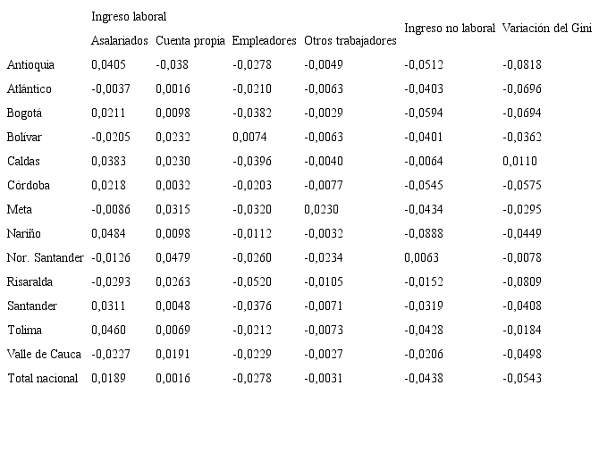 De este modo, se observa la heterogeneidad presente en la influencia de las fuentes de ingreso en los cambios de la desigualdad de cada departamento. Si bien existen rasgos similares en la influencia del ingreso no laboral y en el efecto del ingreso de los trabajadores por cuenta propia (con excepción de Antioquia), también hay que destacar las diferencias en los niveles de influencia de cada fuente de ingreso en los cambios distributivos, así como los contrastes del ingreso de los asalariados, lo cual afectó de manera diferenciada a la evolución de la desigualdad en cada departamento.