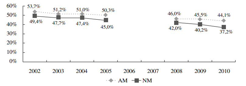 En primer lugar, la NM estimó una sola LP y LI para toda la zona urbana, mientras que la AM estimó 13 LI y 13 LP para cada una de las principales ciudades. Segundo, en la elaboración de la canasta de la NM la información utilizada es más representativa, ya que la cobertura de la encuesta nacional de ingresos y gastos 2006-2007 (ENIG06-07) es mucho mayor que la encuesta de ingresos y gastos de 1994-1995 (EIG94-95). Por otro lado, en la NM se puede estimar la LI y LP rural, ya que la cobertura de la encuesta incluyó la zona rural; para la estimación en la AM en la zona rural se debió usar otra fuente de información15 (sin embargo, se debe señalar que la AM estimó, por primera vez, las líneas rurales con criterios evidentes a la opinión pública, a diferencia de las anteriores mediciones16). En contraparte, la NM resalta que la estimación de las LI y LP, para los dominios urbano y rural, se hizo solo con la ENIG06-07, lo cual representa una evidente ventaja, siempre y cuando no se hubiera imputado la mayoría de datos de gastos de alimentos.