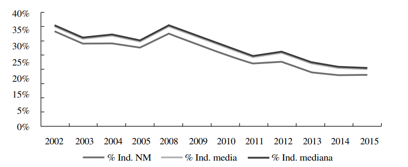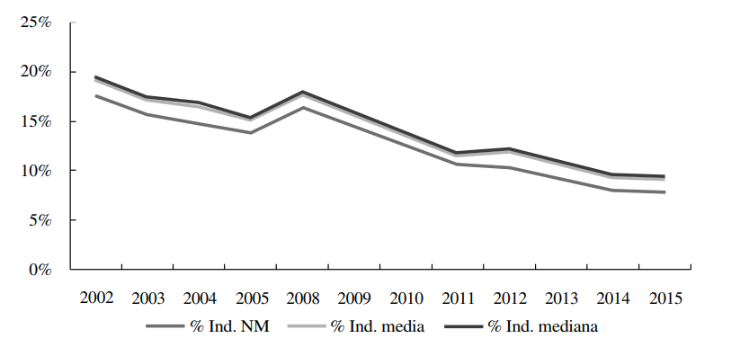 De esta manera, para la NM, en el periodo comprendido entre el 2002 y el 2015, hubo una reducción de 15,1 pp; en cambio, al utilizar la media la reducción fue de 14,8 pp; y, al emplear la mediana, fue de 14,9 pp. La diferencia promedio de la estimación de la indigencia del documento, en el mismo lapso usando la media, frente a la de la NM es de 2,52 pp; en cambio, al trabajar con la mediana la diferencia fue de 2,92 pp.