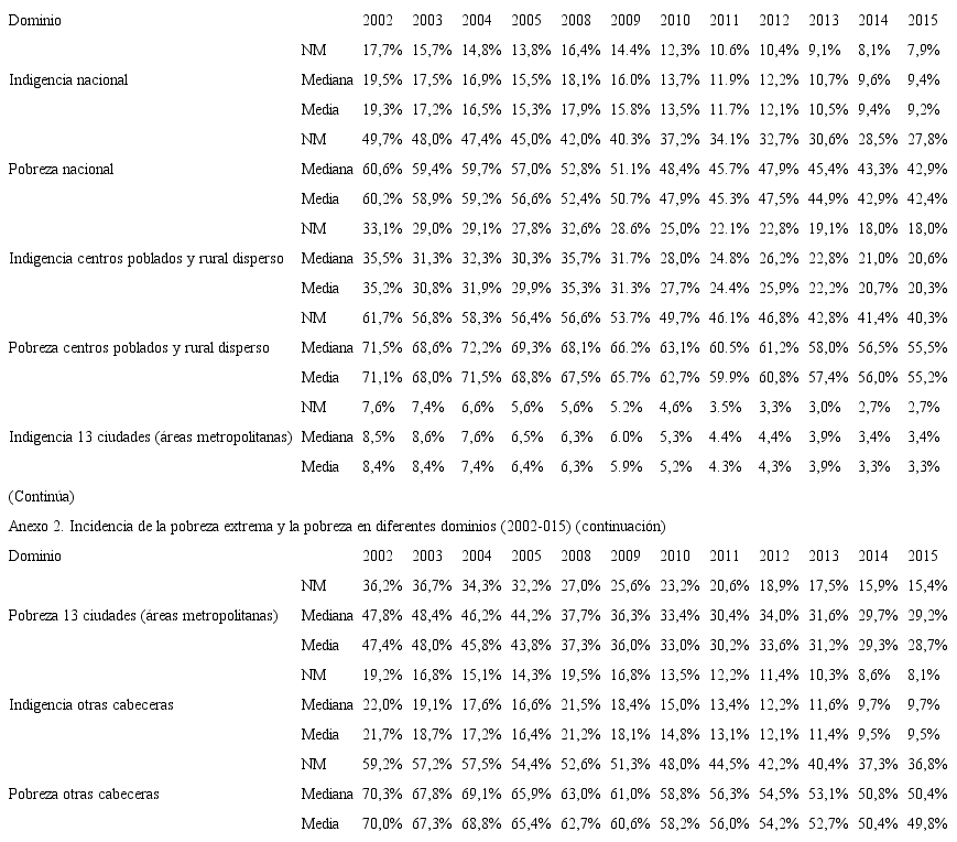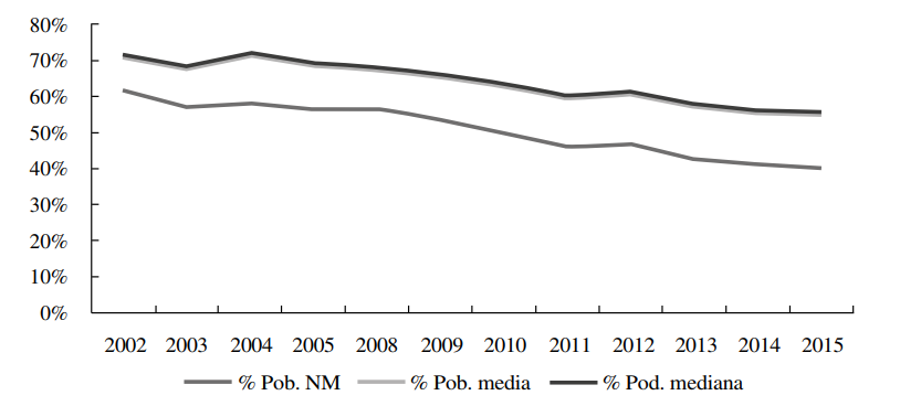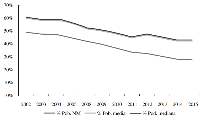 se pasó del 60,2% al 42,4% (una reducción de 17,7 pp), y si se utiliza la mediana se pasó del 60,6% al 42,9% (una reducción de 17,7 pp). Nótese que las diferencias porcentuales pueden esconder en parte el trasfondo de la discusión. Por ejemplo, si se tiene en cuenta que la NM indicó, para el 2015, que la pobreza se ubicó en un 27,8%, y los resultados del documento con la mediana indicaron que fue del 42,9%, y con la media 42,4%, esto indica que, para la NM durante ese año, hubo alrededor de 13,4 millones de pobres en el país. En cambio, con la mediana y la media habría 20,6 y 20,4 millones de pobres. Por ende, se estarían desconociendo 7,2 y 7 millones de pobres que requieren asistencia pública.