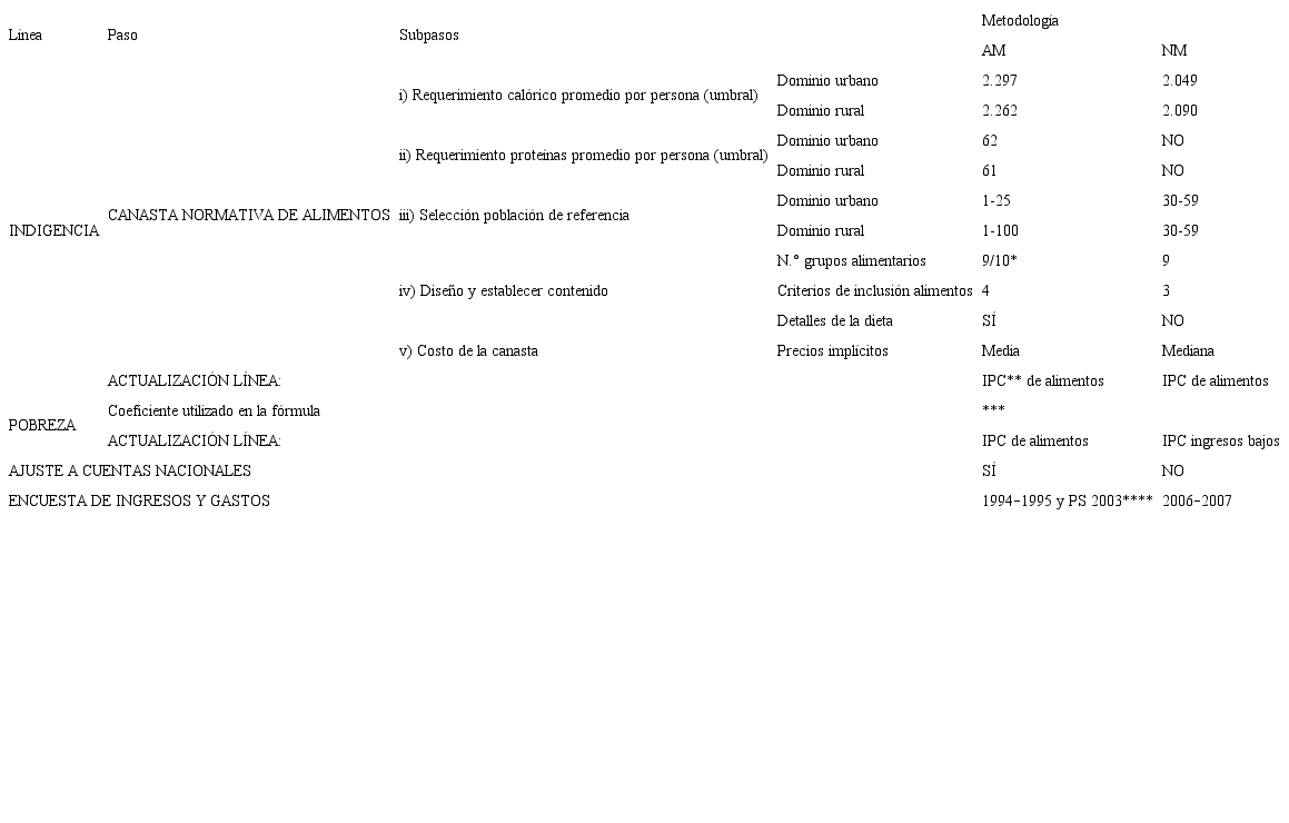 En este apartado se sintetizan y explicitan seis de las diferencias principales entre las últimas dos metodologías que estimaron las LI y LP para el país, las cuales en adelante se denominarán “anterior metodología” (AM) y “nueva metodología” (NM). El documento toma como referente los trabajos de Muñoz y Rivas (2006), y el de la Misión de Expertos para el Empalme de las Series de Empleo y Pobreza (MESEP, 2011). El primer trabajo comenta los aspectos metodológicos trabajados en la AM; el segundo detalla los de la NM.