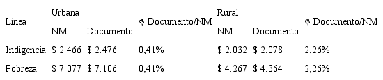 Cabe hacer una aclaración pertinente. Las LP que aparecen en la Tabla 2 fueron obtenidas con el CO endógeno de cada dominio (2,87 para el dominio urbano, y 2,1 para el rural). Así, la estimación del documento de las LI y LP urbana y rural es superior, en términos porcentuales, frente a la NM en 0,41% y 2,26%. En síntesis, se puede apreciar que en el peor de los casos el margen de error estaría situado alrededor del 3%. Por ende, los cálculos que presenta este documento tendrían una confiabilidad del 97%. De acuerdo con esto, se procedió a adelantar los elementos de esta propuesta.