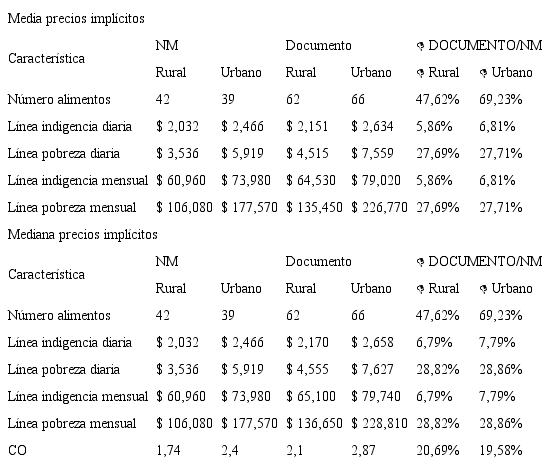 En esta sección se comparan los resultados en cuanto a las diferencias obtenidas entre los resultados de la NM y este documento, con respecto al número de alimentos, el CO y los valores diarios y mensuales per cápita de las LI y LP. Para esto se utilizó, tanto la media, como la mediana de los precios implícitos, en relación con la PR comprendida entre los percentiles 30 a 59 para los dominios rural y urbano (véase la Tabla 3)25.