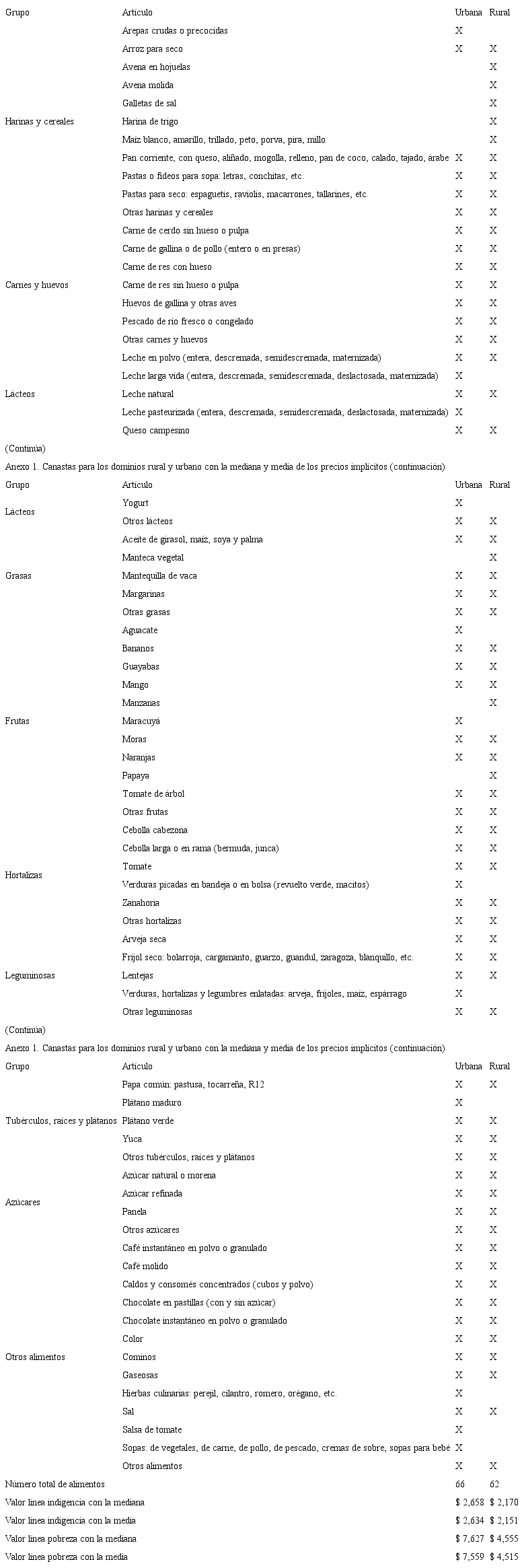 Es pertinente hacer una mención a la intencionalidad que se persigue con la propuesta. Es decir, no se trata solo de seleccionar unos criterios de trabajo sin explicar sus razones. El documento estableció trabajar con los elementos señalados, pues lo que está en el fondo de la discusión son las personas más vulnerables de la sociedad colombiana. Así, se puede notar que el ejercicio que plantea este documento se diferencia en cuatro puntos frente a la NM: las canastas son valoradas con la media y mediana de los precios implícitos; se trabaja con los CO de la encuesta; se incluye un cuarto criterio atendiendo a la AM; y se tiene en cuenta la sugerencia de la CEPAL de incluir todos los alimentos en el rubro “otros” de cada grupo alimentario.