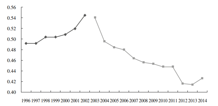 In 2003 the trend was reversed. The Gini coefficient fell sharply in between 2003 and 2005, returning to similar levels as those observed in the mid-1990s. While the rate of decline subsequently slowed, the Gini coefficient kept falling, settling at around 0.42 between 2012-201412.