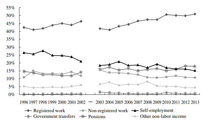 Household income is heterogeneous: each household derives its total income from various sources and in different proportions. There is a growing trend that the share of household income is mainly being derived from formal labour, and, at the same time, there is a reduction in income from non-formal labour self-employment (see Figure 2). Overall, labour income varies between 74% to 83% of total household income during the period being analysed There is a growing trend in the 1990s, a steep fall in the aftermath of the 2001-2002 crisis, and then a recovery starting in 2004. Specifically, formal labour income (that of registered workers) increased in the 2000s and reached half of total household per capita income (50%) in the five years from 2010 to 2014. on-labour income, pensions and retirement pay significantly increased their participation in household income from 14.7% in 1996 to 19.8% in 2014; this was mainly due to a series of public policies relating to minimum income and pensions for the elderly.