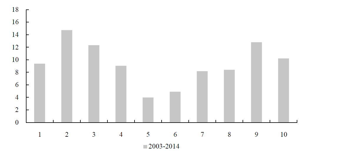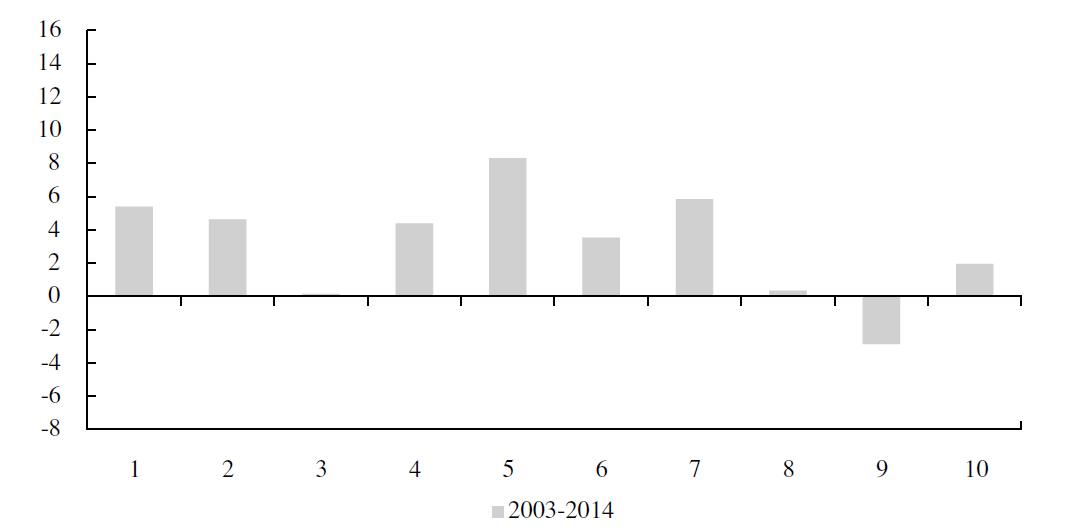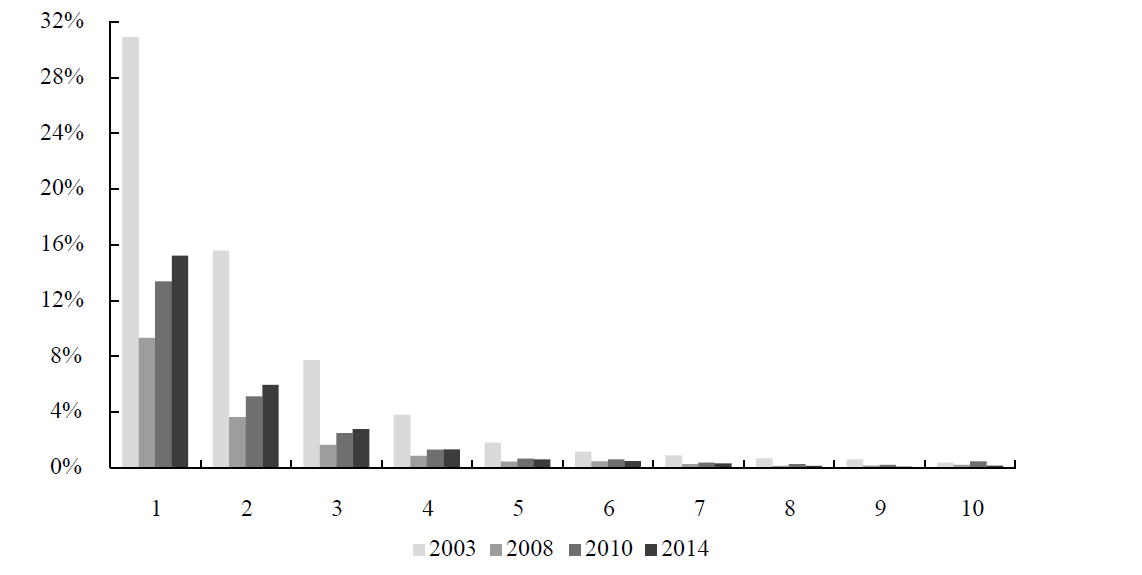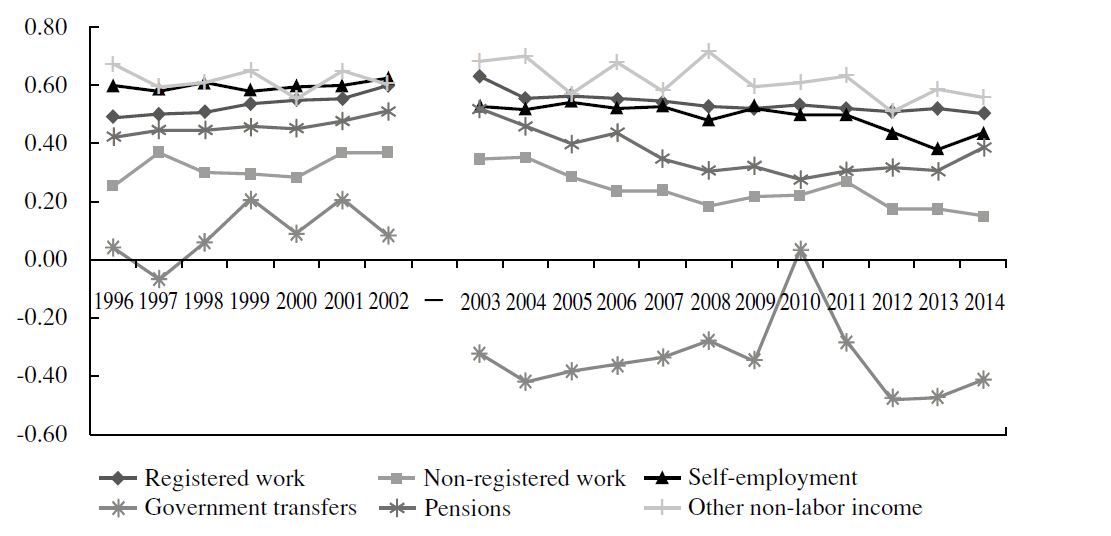 To sum, RP played a central role in reducing the Gini coefficient from 2003 to 2014 due to, the policy decision to use RP as a welfare protection tool. Because of this, the Gini coefficient for RP fell from 0.41 in 2003 to 0.31 in 2014, which is a 25% decrease in RP income inequality. Figure 7 clearly presents that the distributive change in this income source is generated by greater participation from the lower income deciles compared with those from higher income deciles (8, 9 and 10).