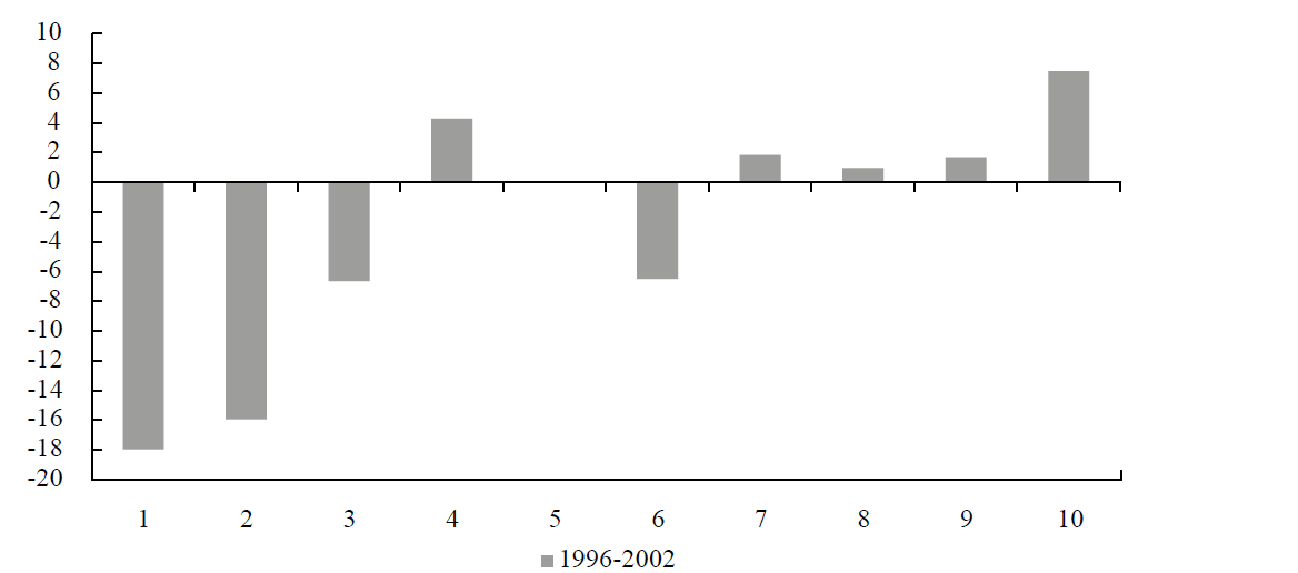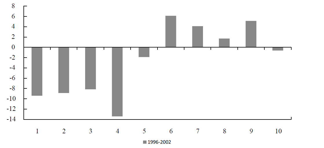 While formal labour became a larger component of total household income (rising from 42% in 1996 to 46% in 2002), its distribution was radically shifting away from the poorest households in favour of the wealthier households, as shown in Figure 4. This is reflected in a significant increase in the income concentration coefficient derived from formal labour: from 0.49 to 0.60 over this period. It is important to mention that the increase in FL’s contribution to overall household income (the participation effect) was driven not driven by formal employment, on the contrary it was driven by unemployment and recession. In any case, growth in formal labour income was highly concentrated in the higher deciles of the income distribution, and, as such, was an important component of the increase in household per capita income inequality. The concentration effect explains most of FL’s contribution to the change in inequality over the 1996-2002 period (70%).