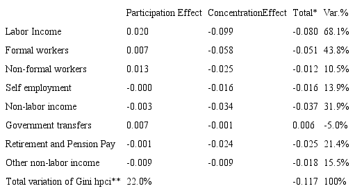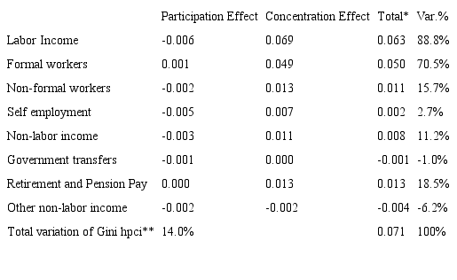 The greatest part of this effect was transmitted by using the concentration effect. Recall that the concentration of any income source depends on the distribution of all income from that income source among its recipients as well as their location over the distribution of total income. Throughout this period, the second effect prevailed: the recipients of formal labour income were located progressively on higher deciles of income, which generated a positive and relevant concentration effect.