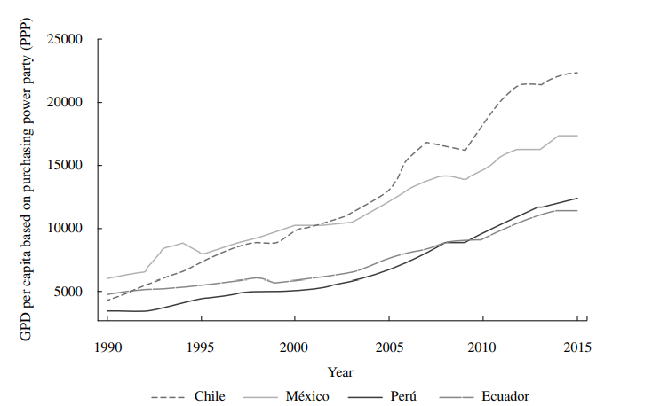 3) Ecuador’s PPP income levels and evolution are similar to those of Perú (see Figure 1). This is important because López-Calva and Ortiz-Juárez (2014)’s definition is based on panel datasets from Chile, México, and Perú, which are not necessarily similar to Ecuador. Because Ecuador does not have panel datasets that allow these thresholds to be directly calculated, our use of the thresholds proposed by López-Calva and Ortiz-Juárez (2014) need to be justified. Indeed, because the income distributions in Chile, México, and Perú are different from each other, and mobility is also different, the income threshold corresponding to a 10% probability of falling into poverty is $8.4 in Chile, $9.8 in México, and $9.6 in Perú.7 While these differences are not large, it makes sense to compare Ecuador’s income levels and trends with these countries. In Figure 1 we show that Mexico and Chile have higher GDP per capita levels in PPP than Ecuador; however, Peru’s income is more similar. Furthermore, for the period analysed by López-Calva and Ortiz-Juárez (2001-2006), Ecuador actually had a higher GDP per capita in PPP than Perú. Additionally, the trends for all four countries appear similar over the 1990-2015 period.