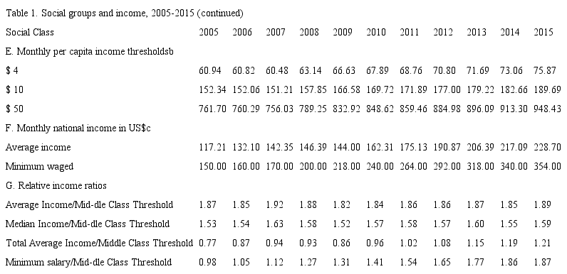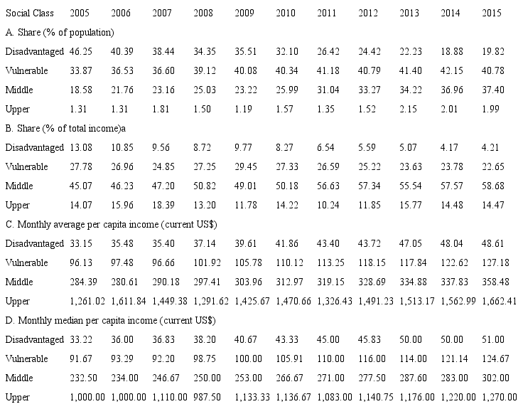 Panel E presents the levels of nominal monthly per capita income corresponding to the $4, $10, and $50 (PPP 2005 international $) thresholds that define each social group.9 Panel F presents aggregate average income and minimum wage over the period. Panel G uses this information to calculate measures of the relative income of each social group and of society in general. In the first part, we calculate the ratio of the middle class' median monthly per capita income (panel D) in comparison to the monthly per capita income that is required to be part of the middle class (i.e. the monthly per capita income corresponding to 2005 PPP $ 10, panel E). The ratio has increased over the period, thus providing further evidence of the improvement that has taken place throughout the last decade. In the second part, we calculate the ratios of the average per capita income and the minimum salary compared to the household per capita income required to be part of the middle class. These ratios show that the average income and the minimum salary have significantly increased relative to the income required to be part of the middle class. While in 2005 the average monthly income represented 0.77 of the middle class threshold and the minimum wage covered 0.98, by 2015 they covered 1.21 and 1.87, respectively. Thus, becoming part of the middle class has become significantly easier over the last decade.