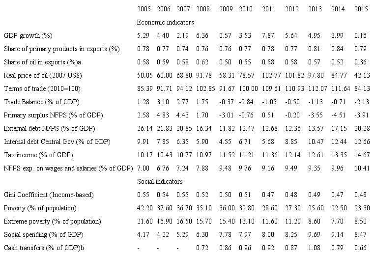 Consider first the context in which the rise of the middle class in Ecuador took place. Table 2 provides a brief summary of the main economic and social indicators in Ecuador during the last decade. Ecuador has experienced high rates of growth and strong declines in inequality. We can see, however, that growth has been associated with the rise of the price of oil (and other commodities). Between 2005 and 2013, the terms of trade grew by 31%, and between 2005 and 2011 the real price of oil more than doubled. But, in the same way that a rising oil price fuelled growth during most of the period, large declines in 2009 and 2015 –which are also reflected as large falls in the terms of trade– had negative effects on growth. The rebound between 2010 and 2014 temporarily helped restore growth, but Ecuador’s macroeconomic and fiscal balances had already changed in 2009. Since that year, the trade balance has been negative and the non-financial public sector (NFPS) has experienced primary deficits. To some extent, these macroeconomic conditions have been compensated for by increasing internal and external debt as well as higher taxes. Despite this, prospects in the short-run are not encouraging.
