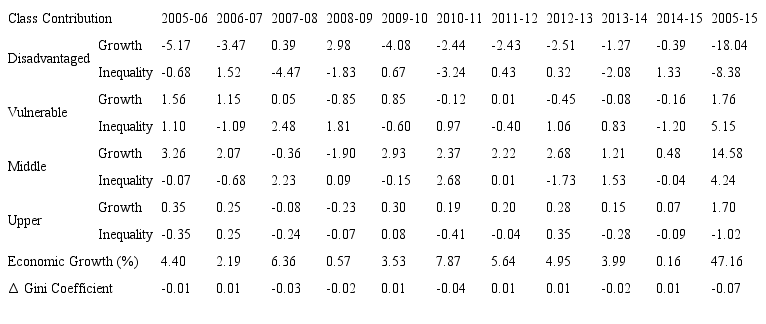 Table 3 shows the results from a decomposition of the effects that growth and inequality reduction have had on the changes in the disadvantaged, vulnerable, middle class, and upper class population shares during the period 2005-2015. The analysis is based on the methodology proposed by Datt and Ravallion (1992), which originally quantifies the relative contribution of growth and redistribution to changes in poverty (e.g. the headcount index). The decomposition separates the total variation in poverty into two components: growth and redistribution. The growth component is defined as the variation in poverty due to a change in mean income while the distribution of income is held constant at the initial level. The