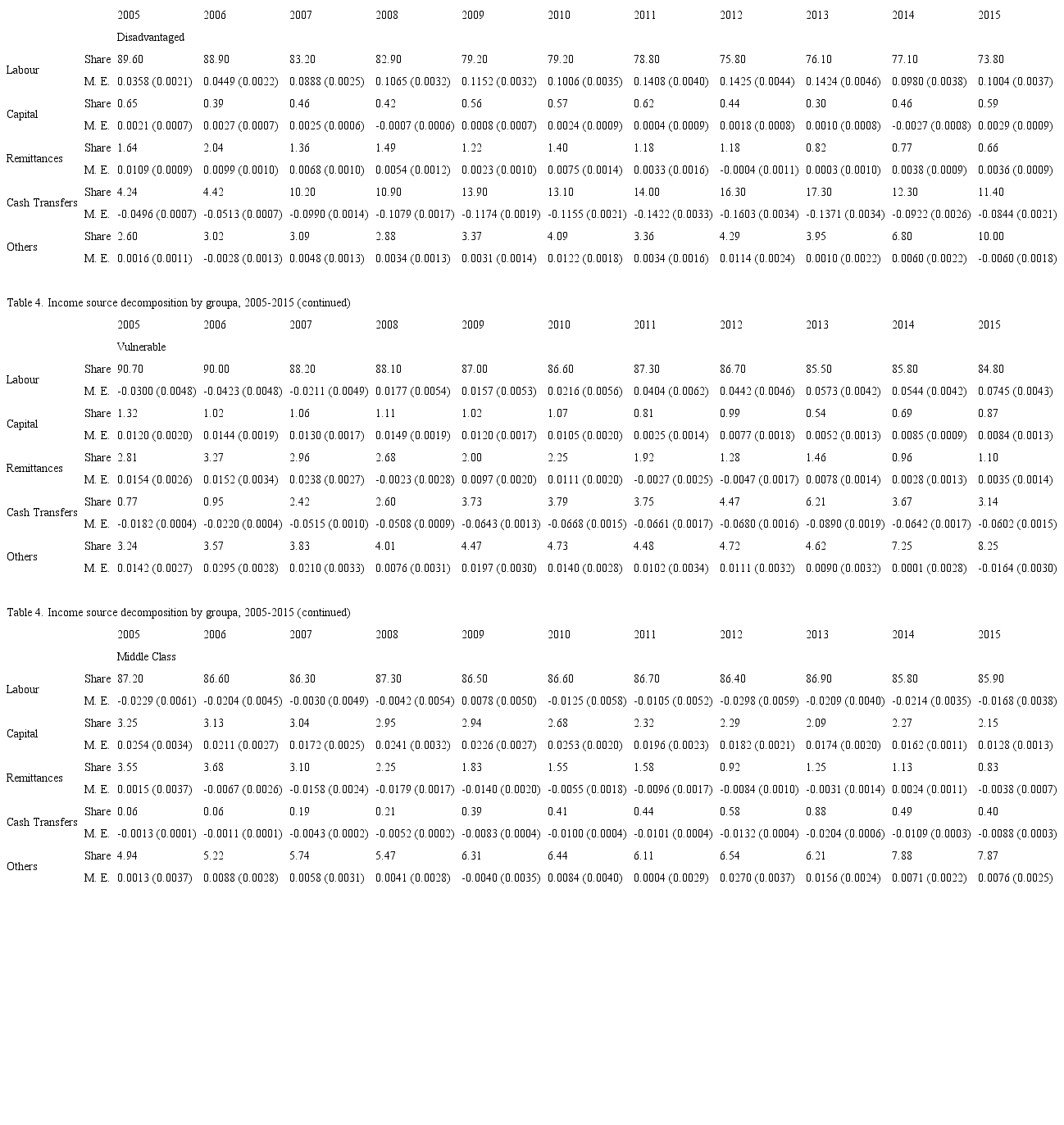To analyse how these changes have affected households’ income, in Table 4 we present the results of a decomposition of income inequality by source for the disadvantaged, vulnerable and middle class groups. We separate sources of income into labour, capital, remittances, cash transfers, and other sources. The last category includes social security benefits, retirement pensions, and donations and gifts. Social security benefits and retirement pensions constitute the majority of this category.