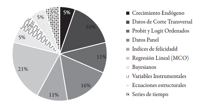 La gran mayoría de trabajos que involucran identificación de determinantes son econométricos, y la técnica empleada puede ejercer una fuerte influencia sobre los datos. Por ejemplo, a fin de identificar el efecto del ingreso se han usado modelos de corte transversal y regresión lineal (Easterlin, 2013; Feeny et al., 2014; Gielen y Van Ours, 2014; Liang y Wang, 2014) en países como China, Alemania y Estados Unidos. Aunque estos trabajos tienden a encontrar una relación positiva entre el ingreso con mayores niveles de felicidad, los resultados son difícilmente comparables por los cambios en metodología, periodo y país. Sería deseable tener más trabajos comparables que distingan entre efectos de corto y largo plazo y posibles no linealidades (si el ingreso tiene un efecto positivo a niveles bajos que se pierde más allá de cierto punto). La comparabilidad se facilitaría con la inclusión de la felicidad en el sistema de cuentas nacionales (Antolini, 2016; Batz, Parrigon y Tay, 2016).