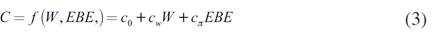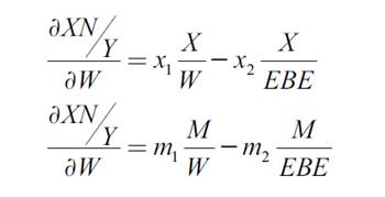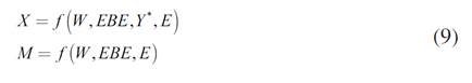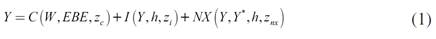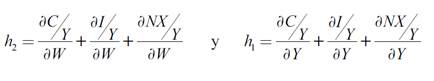donde C, I, NX, W y EBE son el consumo, la inversión privada, las exportaciones netas, la masa salarial y el excedente bruto de explotación en términos reales; por su parte, h es la participación de los beneficios en el ingreso (EBE/Y), y las zetas son otras variables que se considera afectan a cada una de las funciones, como son: el tipo de cambio, el coste del capital, la inversión pública y otras (que se explicarán más adelante).