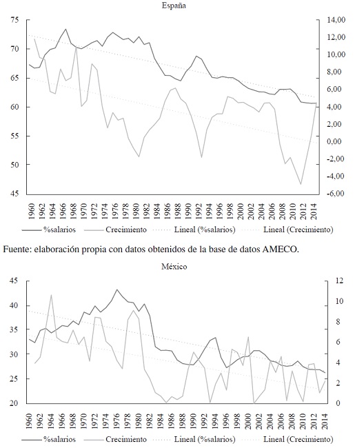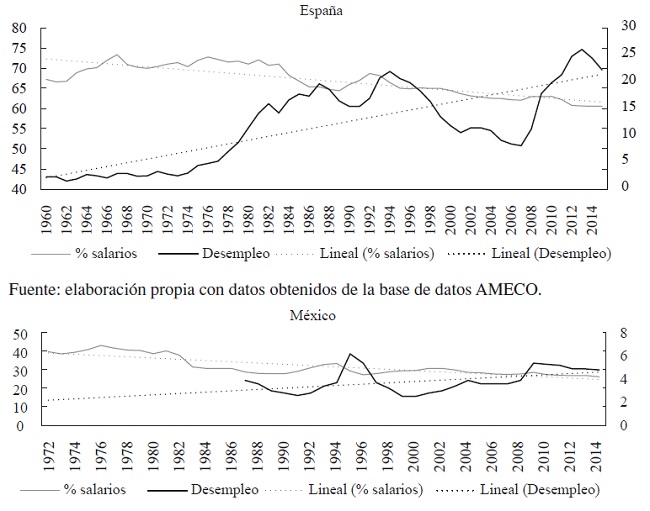 En las gráficas 1 y 2 se presentan los datos de la participación de los salarios y las tasas de desempleo y de crecimiento del PIB real para España y México -en el caso de México la participación de los salarios es menor de la real, puesto que no se imputan los ingresos salariales de los trabajadores independientes, pero la tendencia es la misma a la de otros trabajos en los que se la imputan, como, por ejemplo, en Sama-niego (2015)-. La caída de la participación de los salarios, la cual, desde su valor más elevado, que en ambos países se sitúa en el año 1976, hasta el presente, han sido de un 12 % y un 17 % para España y México, respectivamente, no se ha visto reflejado ni en un aumento de la tasa de crecimiento, ni en un descenso del desempleo en ninguno de ambos países. Parece pues que la disminución de los salarios no ha traído los beneficios que se preveían asociados a las políticas de contención salarial, tal como se definen de forma eufemística.