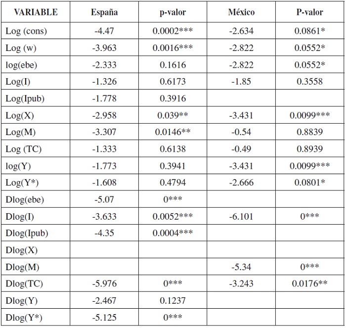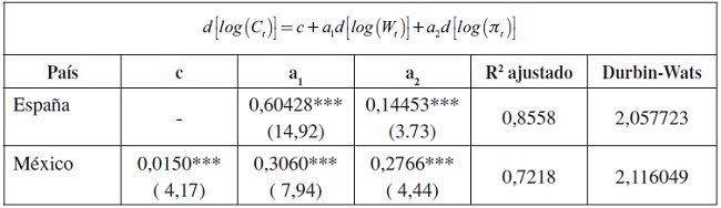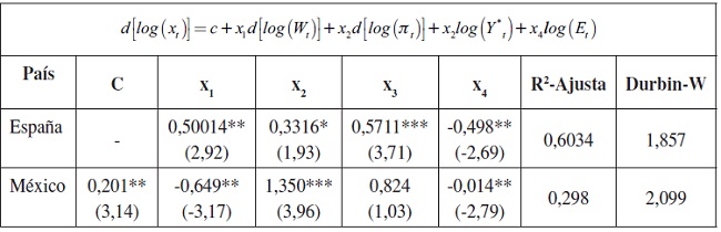 La mayoría de las variables son I(0) en logaritmos, excepto los beneficios reales en el caso de España, por lo que en este caso se estima en diferencias. En el caso de México, al ser todas las variables estacionarias en niveles la relación, es tanto de corto plazo, como de largo plazo. Las estimaciones en logaritmos presentan autocorrelación de primer orden, por lo que se estimó en primeras diferencias. Los resultados se presentan en la Tabla 1.