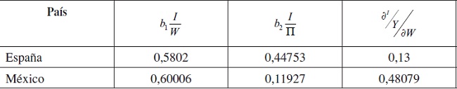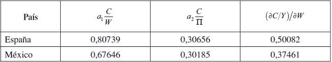 Como se puede apreciar en la Tabla 1, se confirman para ambos países las diferentes propensiones al consumo de los salarios y beneficios, mucho mayor en el caso de España que en el de México, en el que las diferencia en las propensiones es muy pequeña. Esto se debe al hecho de que la parte de los beneficios contiene ingresos sala-riales de los trabajadores independientes que tienen mayor propensión al consumo.