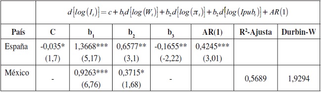 Cabe señalar que para el caso de España se incorporó la inversión pública con el propósito de observar si existía el efecto excluyente respecto de la inversión privada. En el caso de México, la base de datos AMECO no distingue entre la inversión privada y la pública, pero en la base de datos del Banco Mundial si aparece la inversión privada separada de la total, pero la diferencia no parece recoger la inversión pública tradicional, sino que, por la magnitud, incluye la inversión de las empresas públicas, la cual se puede tratar como la privada. Este problema en los datos hace que se elija, para este caso, estimar la función de inversión total en vez de la privada.
